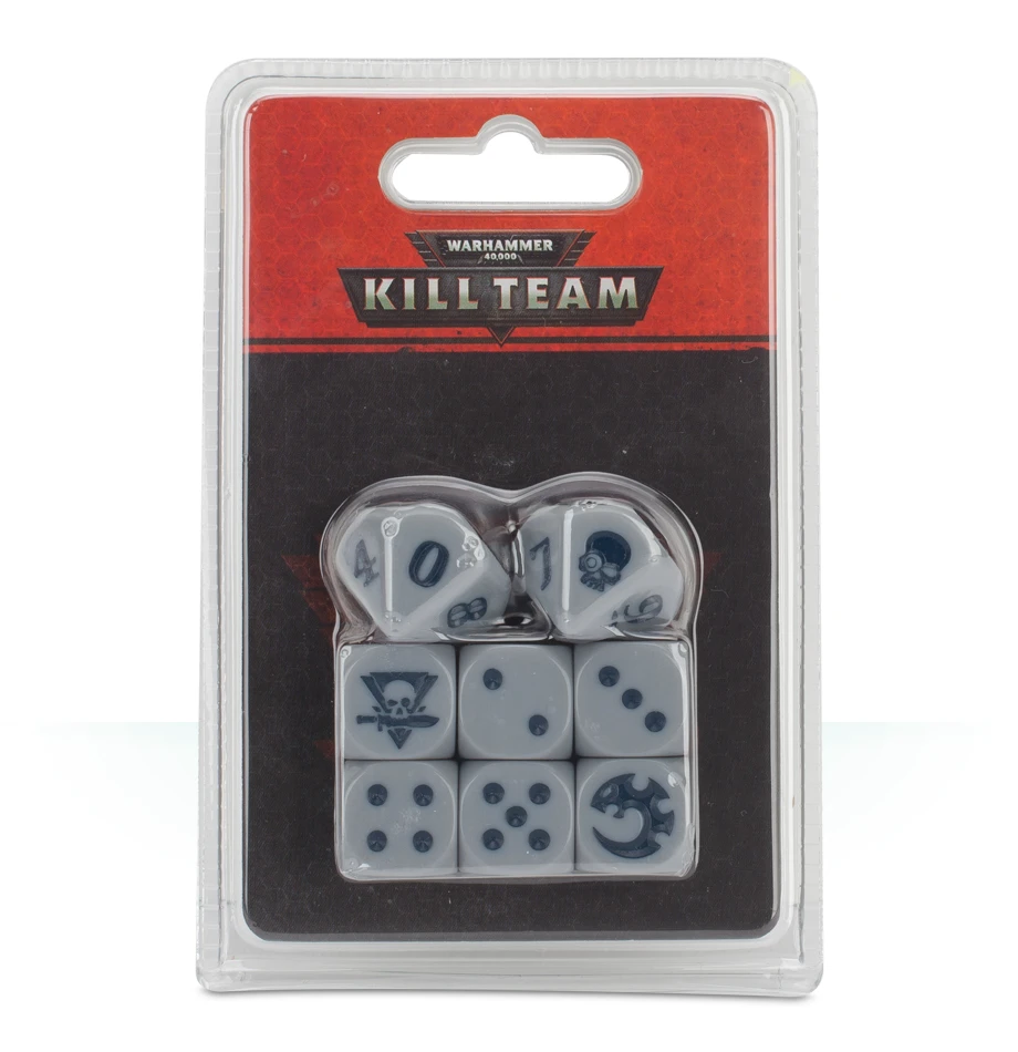 This set contains 6 6-sided dice and 2 10-sided dice – the former used during games of Kill Team, the latter used to roll on certain tables when assembling your squad ready for combat. Themed to match the Genestealer Cults, these dice are flesh-coloured with blue markings. The D6 feature a Genestealer Cults icon in place of the 6 and a Kill Team logo in place of the 1; the D10 feature a skull in place of the 1.