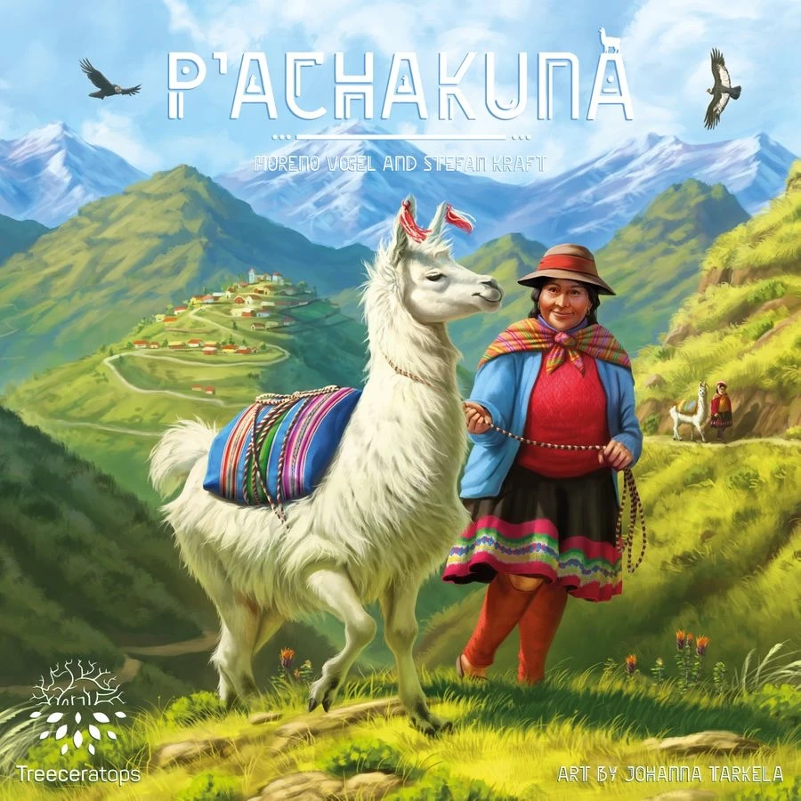 P’achakuna takes you on a journey in the heart of the Andes together with your most loyal friend — your llama. The game includes both black and white llamas, with you controlling one color and your opponent the other. White llamas move only through the green valleys, while black llamas scale the barren mountains. Whatever the color, however, you want to visit mountain villages to deliver the dye that they desire, ideally collecting dye for yourself along the way.